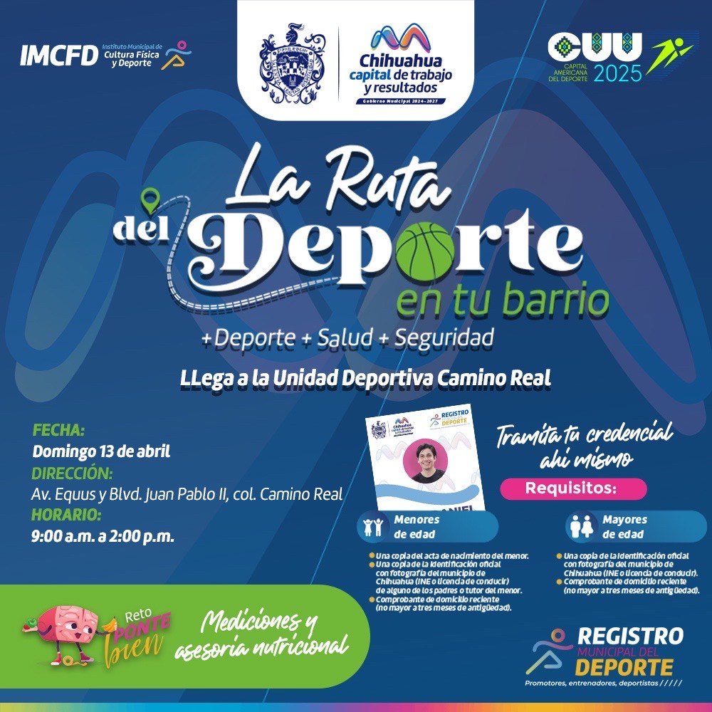 El Gobierno Municipal llevará “La Ruta del Deporte” este fin de semana a la Unidad Deportiva Camino Real, con el objetivo de fomentar a la población chihuahuense en la práctica física y deportiva, a través de la exhibición de disciplinas e información de escuelas en el sector.