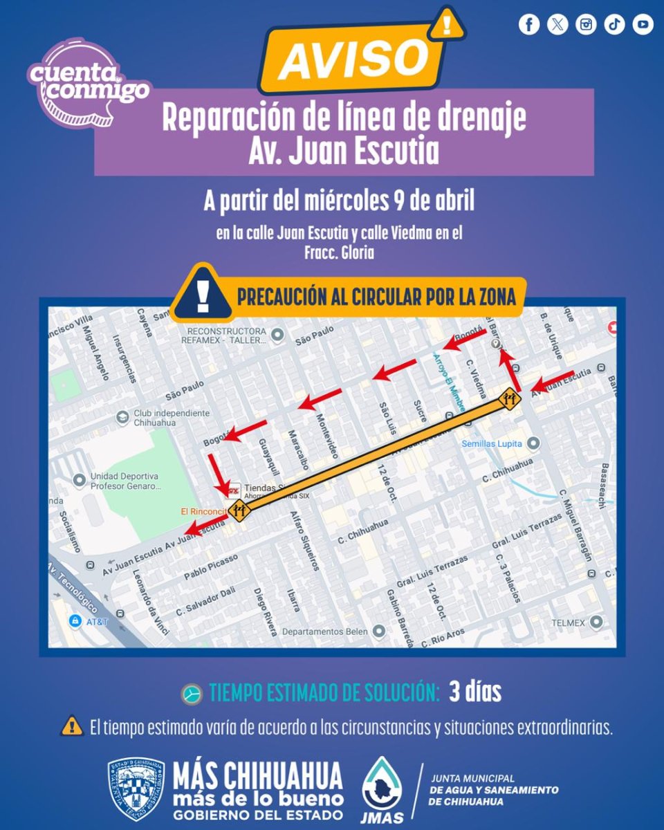 La Junta Municipal de Agua y Saneamiento (JMAS) de Chihuahua, inició con los trabajos de reparación de una línea de drenaje, en el cruce de la avenida Juan Escutia y la calle Viedma.