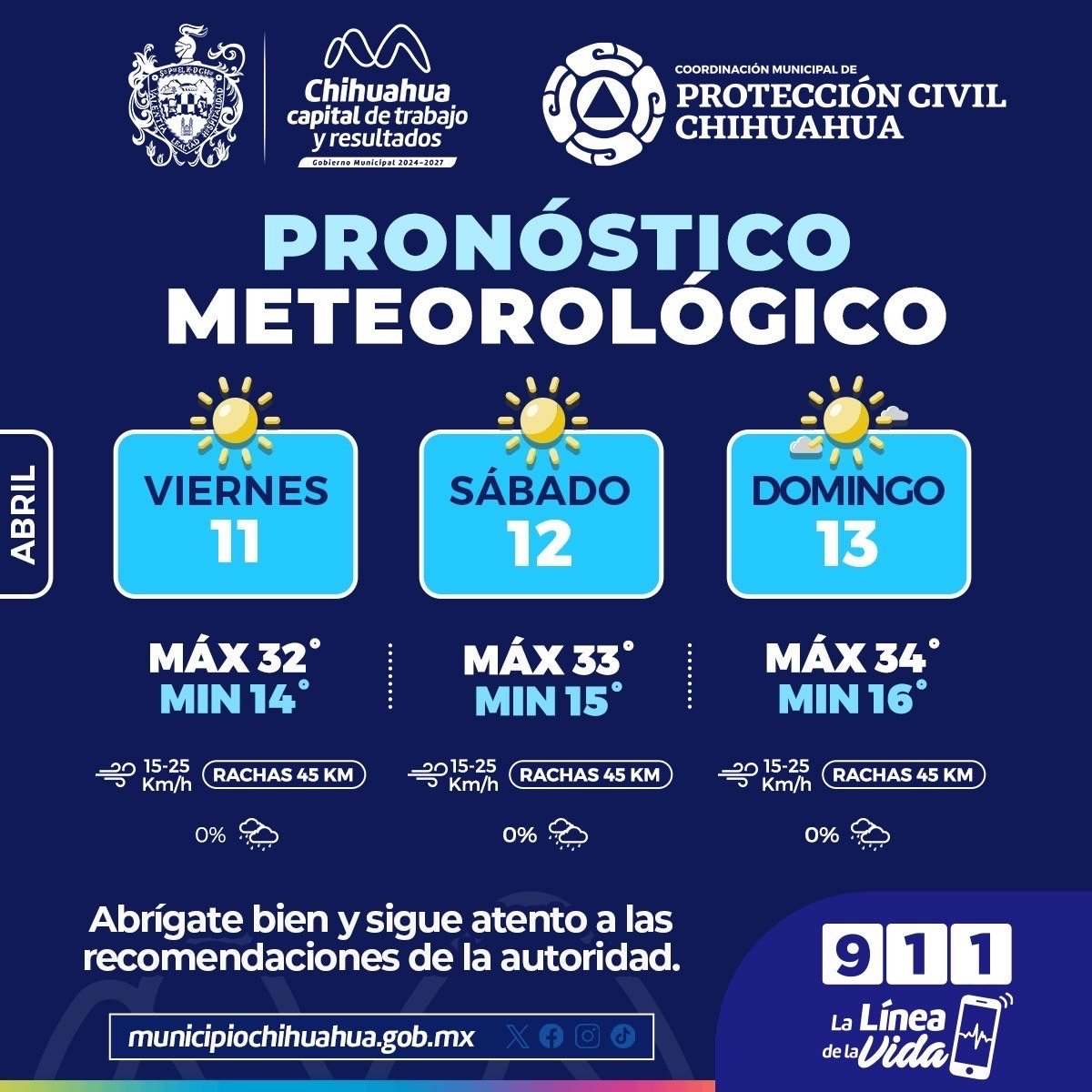 La Coordinación Municipal de Protección Civil, informa que este fin de semana, del 11 al 13 abril, se prevén temperaturas días calurosos con noches frescas, por lo que exhortan a cuidarse de los cambios de temperaturas.