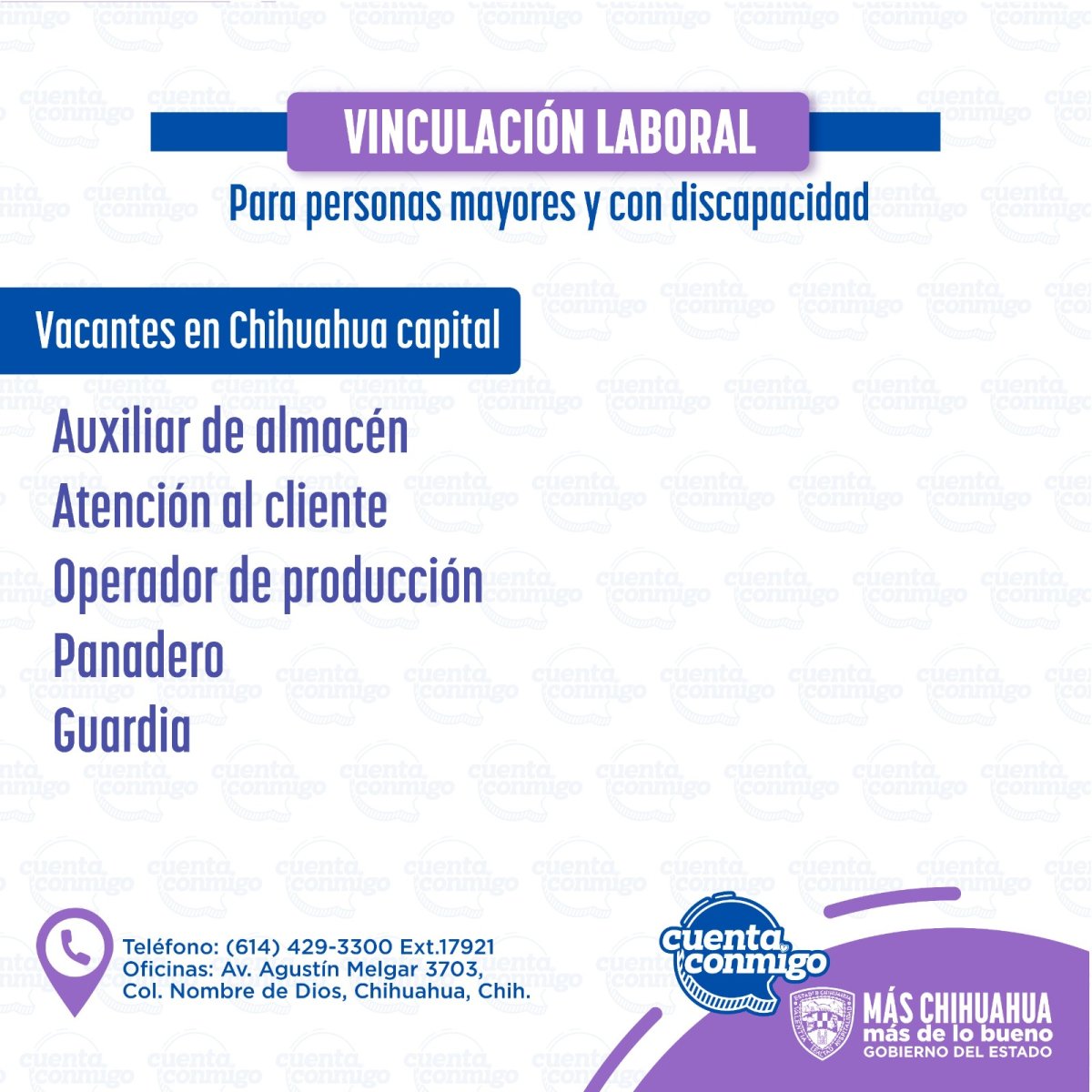 Con el objetivo de promover la inclusión económica de los sectores vulnerables, la Secretaría de Desarrollo Humano y Bien Común (SDHyBC), a través de la Dirección de Grupos Vulnerables, dio a conocer nuevas vacantes laborales en la ciudad de Chihuahua, dirigidas a adultos mayores y personas con discapacidad.