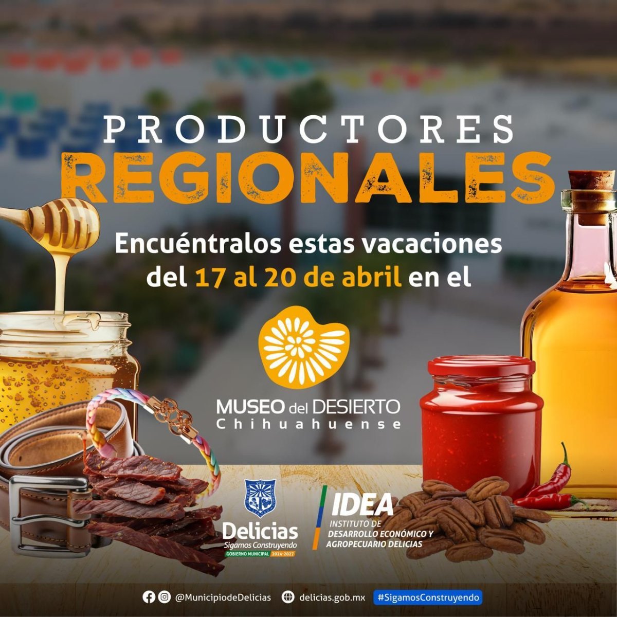 Con el objetivo de fortalecer la economía local y ofrecer una experiencia distinta durante esta Semana Santa, Gobierno del Estado y el Gobierno Municipal de Delicias, a través del Instituto de Desarrollo Económico y Agropecuario (IDEA), invita a la ciudadanía a visitar la muestra de productores regionales que se estará llevando a cabo del 17 al 20 de abril en el Museo del Desierto Chihuahuense.
