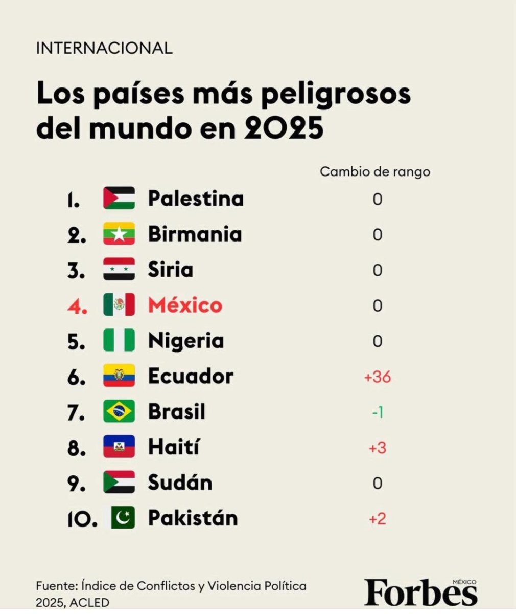 Por otro año, México conserva el cuarto lugar en el ranking, lo que indica que los niveles de violencia y conflicto político se mantienen sin mejoría significativa respecto al periodo anterior.