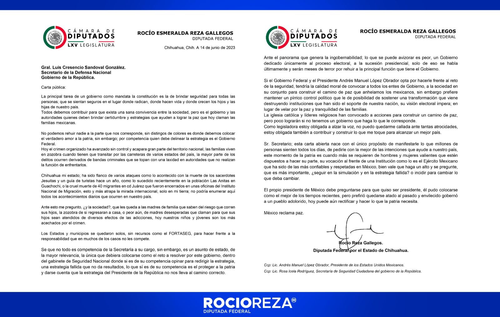Sta Gertrudis, Chih.- La diputada federal del PAN, Rocío Reza Gallegos, entregó personalmente una carta al titular de la Secretaría de la Defensa Nacional, Luis Cresencio Sandoval, en la que pidió atender el reclamo de paz de los millones de mexicanos que se ven afectados por la política fallida en materia de seguridad que mantiene el presidente de la república Andrés Manuel López Obrador.