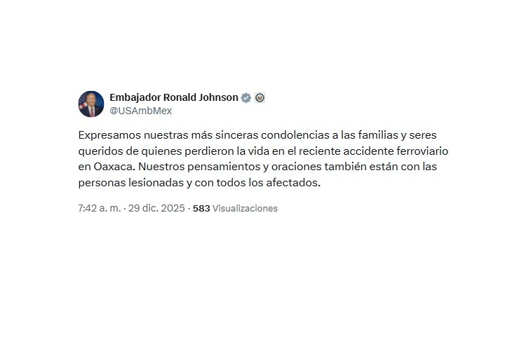 A través de su cuenta en X, Ronald Johnson comentó "Expresamos nuestras más sinceras condolencias a las familias y seres queridos de quienes perdieron la vida en el reciente accidente ferroviario en Oaxaca. Nuestros pensamientos y oraciones también están con las personas lesionadas y con todos los afectados".