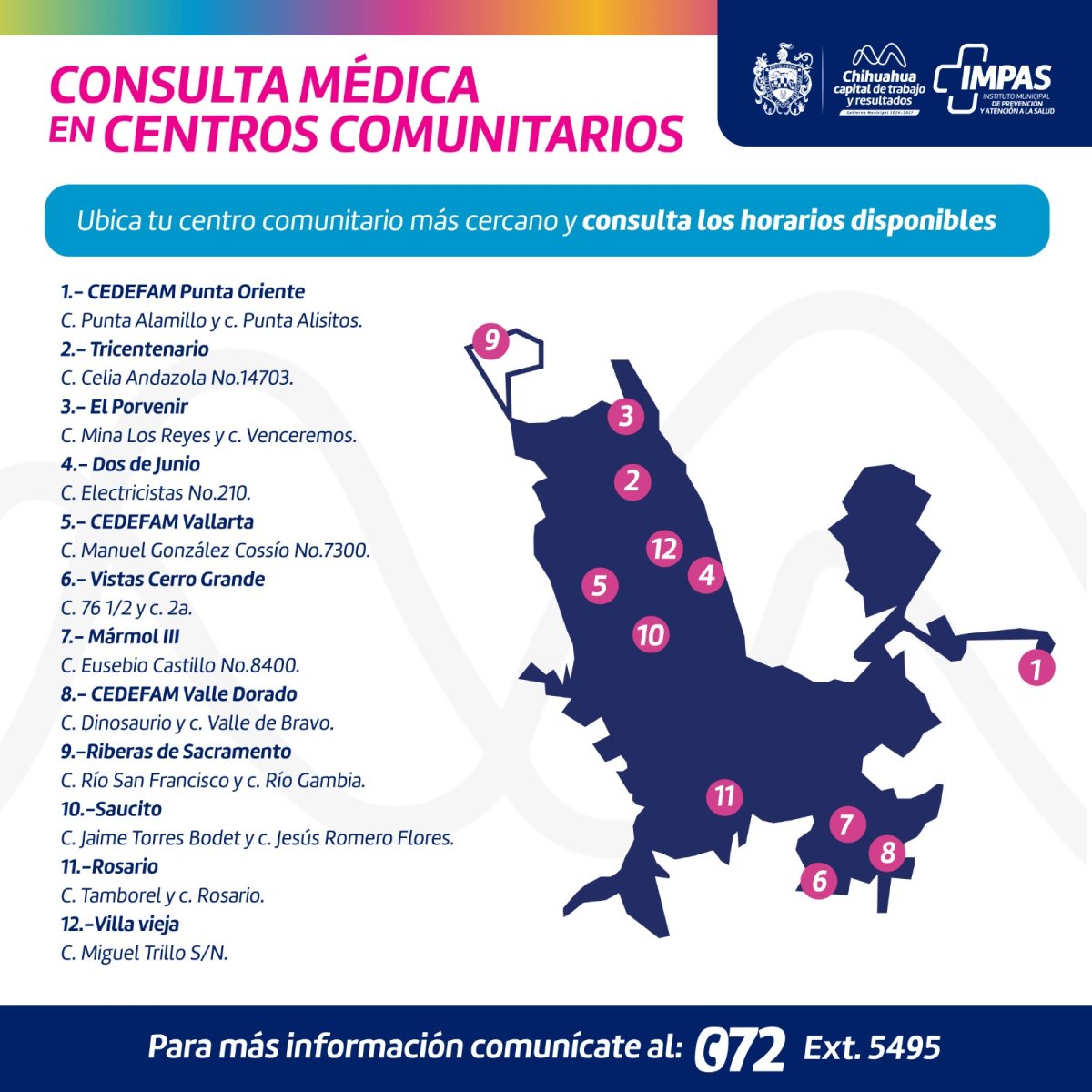 Con el fin de fortalecer la salud de las familias chihuahuenses, así como facilitarles el acceso a servicios de calidad, el Gobierno Municipal de Chihuahua, a través del Instituto Municipal de Prevención y Atención a la Salud (IMPAS), invita a las y los chihuahuenses a hacer uso del servicio de consulta médica, que se ofrece en instalaciones ubicadas 12 centros comunitarios.