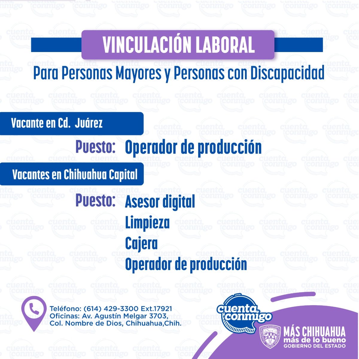 Informó que los puestos disponibles en el municipio de Chihuahua incluyen personal para atención en cajas, operadores de producción, asesores digitales y personal de limpieza; mientras que en Ciudad Juárez se cuenta con vacantes para operadores de producción en el sector maquilador.