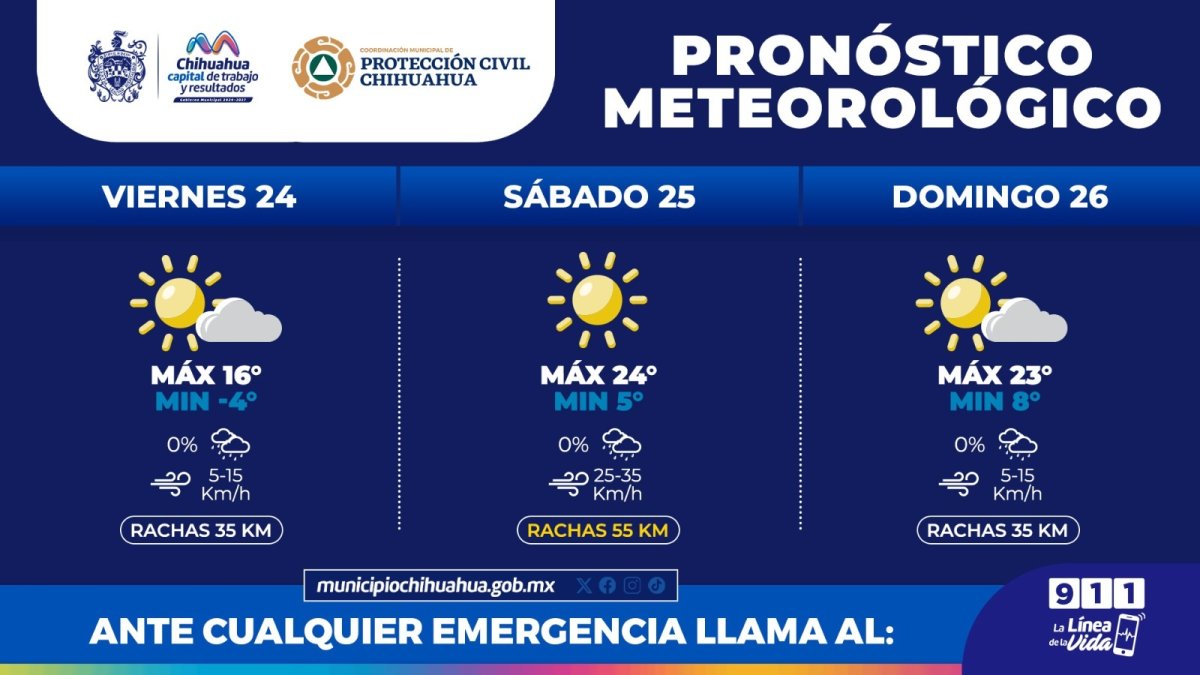 La Coordinación Municipal de Protección Civil informa que este fin de semana, del 24 al 26 de enero, se prevén temperaturas máximas de 24°C y mínimas de -4°C.