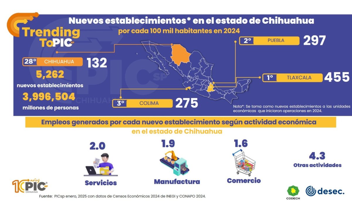 En 2024, en el Estado de Chihuahua se crearon 5 mil 262 nuevas empresas, que representaron el 4% de las 150 mil 252 totales que existían en ese año, de acuerdo con información basada en los Censos Económicos.