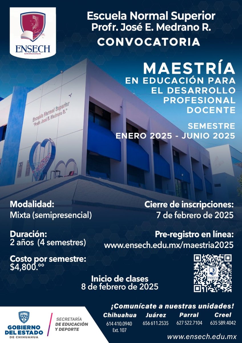 La Escuela Normal Superior del Estado “Profr. José E. Medrano R.” (Ensech), informó que el próximo viernes 7 de febrero concluye el proceso de registro para la Maestría en Educación para el Desarrollo Profesional Docente, por lo que se invita a inscribirse.