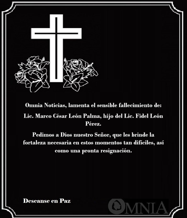 Omnia Noticias se conduele del lamentable fallecimiento del Lic. Marco Cesar León Palma, hijo del Lic. Fidel León Pérez