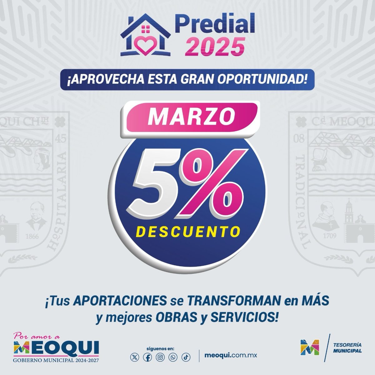 El Gobierno de Meoqui dio a conocer que se encuentra disponible el 5% de descuento para aquellos contribuyentes que deseen realizar su pago de predial, contando con un horario de atención de 9 de la mañana a 2 de la tarde, en las Cajas de Tesorería dentro de la Presidencia Municipal, recordando que en este mes entran como usuario cumplido para el sorteo de electrodomésticos.