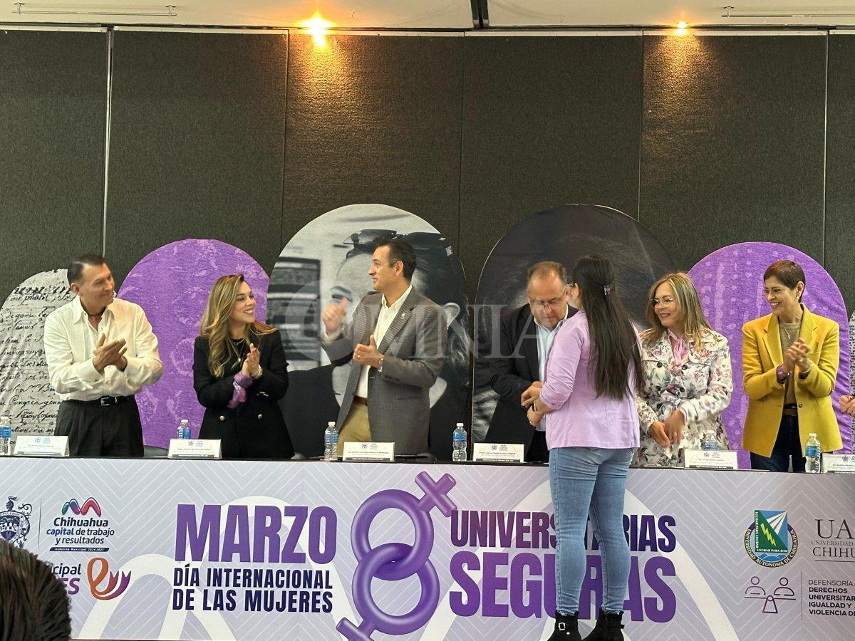 Esta mañana el alcalde Marco Bonilla, encabezó la entrega de Pulseras Centinelas a 500 alumnas de la Universidad Autónoma de Chihuahua (UACH), en compañía del rector, Luis Rivera Campos, la Directora del Instituto Municipal de las Mujeres, Mónica Meléndez, y la regidora, Patricia Ulate.