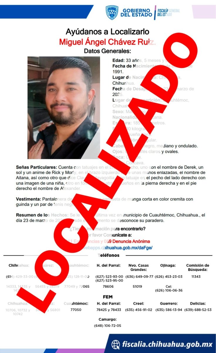 La Fiscalía de Distrito Zona Occidente, dio por concluida la carpeta de investigación iniciada por el reporte de desaparición de Javier Alexis M. M., de 24 años de edad, quien fue localizado sano y salvo.