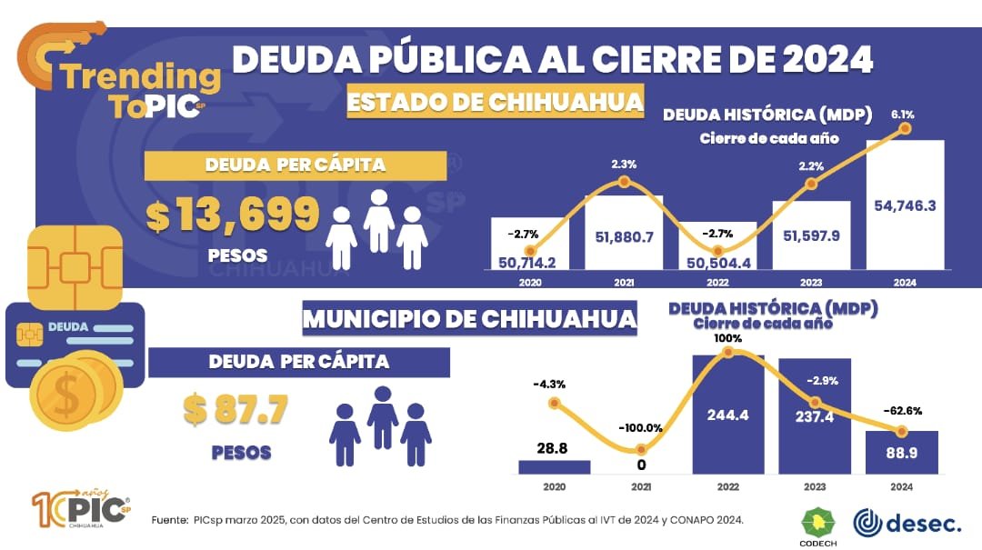 Al cierre de 2024, la Deuda Pública del Estado de Chihuahua era de 54 mil 746.3 millones de pesos, equivalente a una deuda per cápita de 13 mil 699 pesos, según lo informado por la Plataforma de Inteligencia Competitiva del Sector Privado (PIC´sp).