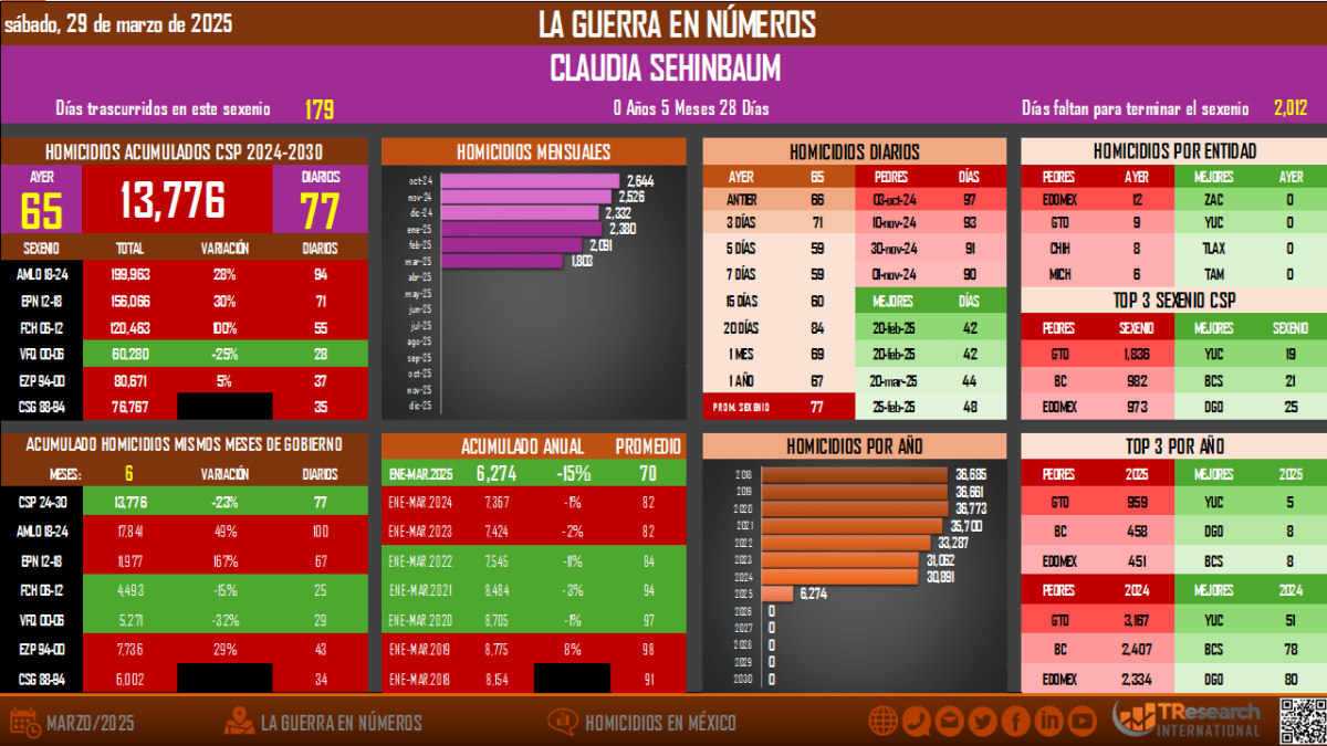 A la actual Administración Federal, con ese acumulado de 13 mil 776 víctimas, se le estimó un promedio de 77 homicidios dolosos diarios.