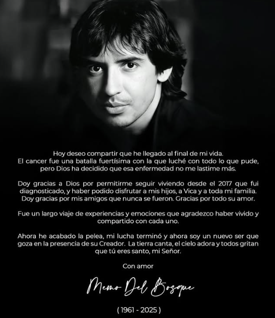 El productor y director de televisión, Memo del Bosque, murió este lunes luego de haber sido diagnosticado con cáncer en el 2017, la noticia se conoció por medio de un mensaje escrito en primera persona que fue compartido en su cuenta oficial de Instagram.