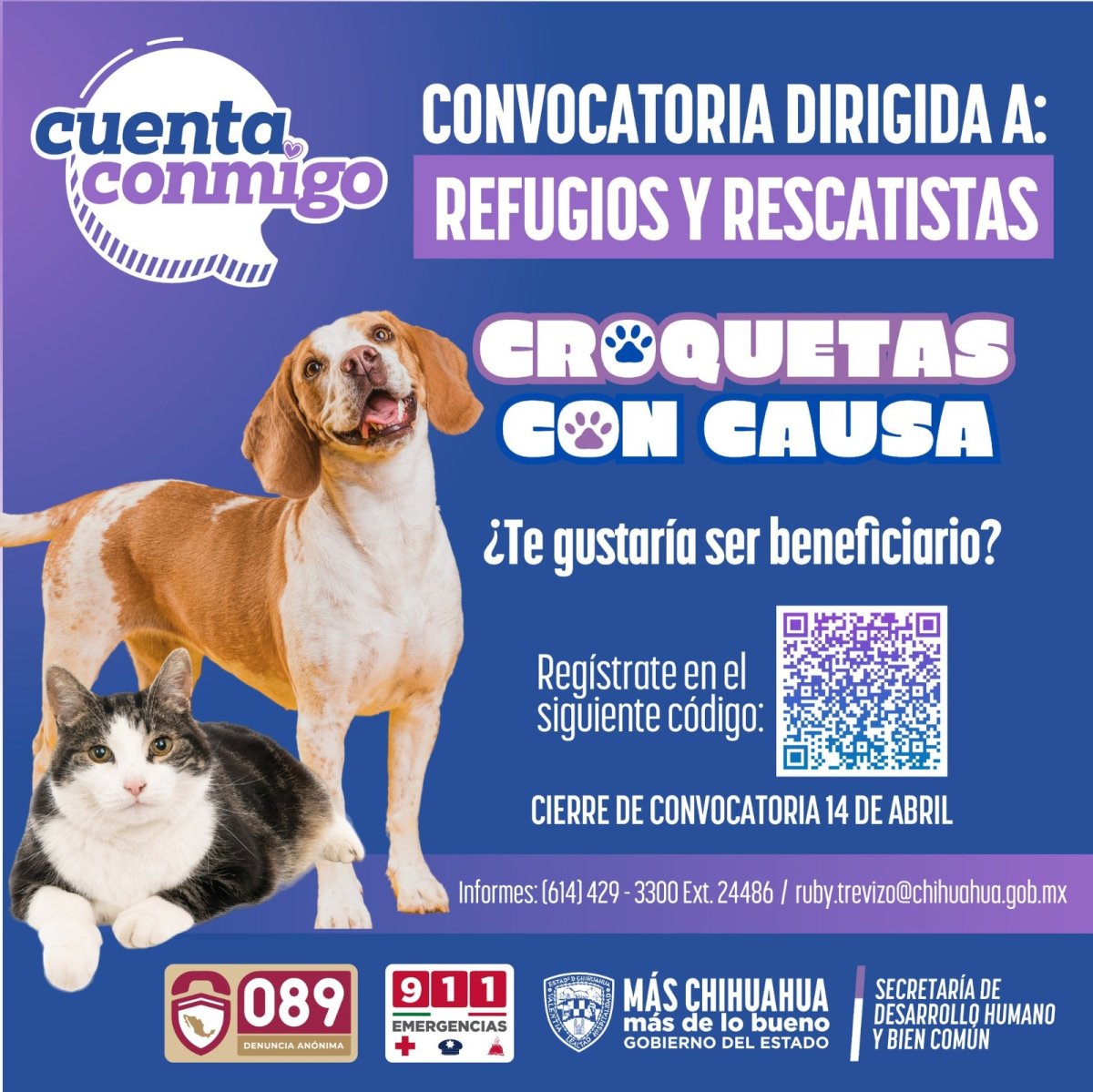 La Secretaría de Desarrollo Humano y Bien Común (SDHyBC) invita a los refugios y rescatistas de animales del estado a participar en la convocatoria “Croquetas con Causa”, dirigida a quienes estén interesados en recibir apoyo con alimento para mascotas.