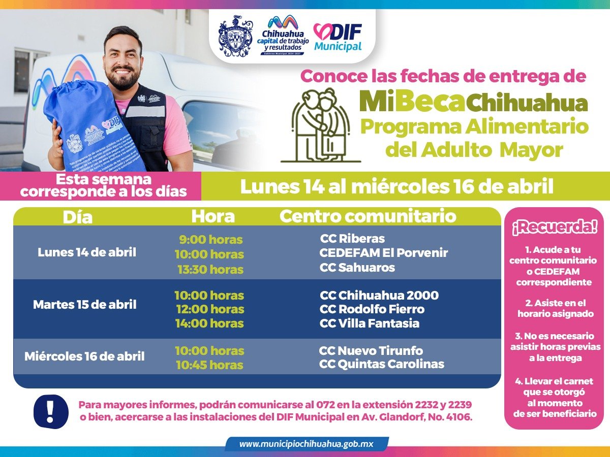MEl DIF Municipal de Chihuahua, informa a las y los beneficiarios del Programa Alimentario del Adulto Mayor (PAAM) los centros comunitarios y horarios en los que podrán acudir por su paquete alimentario del 14 al 16 de abril: