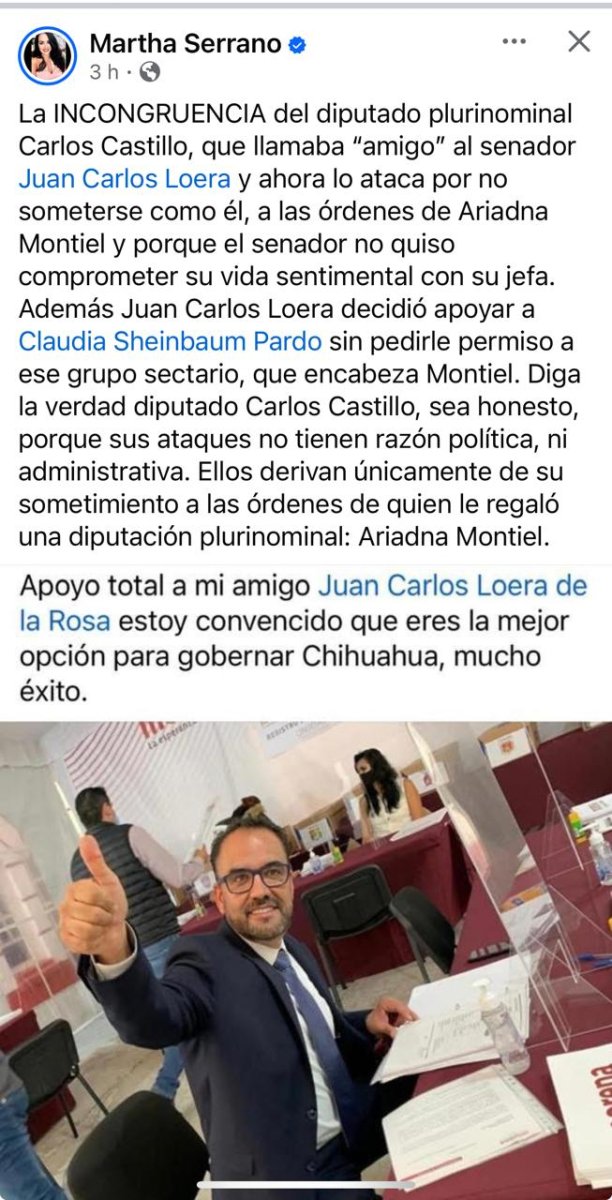 A través de redes sociales, Martha Serrano calificó de incongruentes los ataques de Castillo, recordando que antes se refería a Loera como su amigo. Además, señaló que el conflicto tendría su origen en diferencias dentro del grupo político que encabeza Ariadna Montiel.