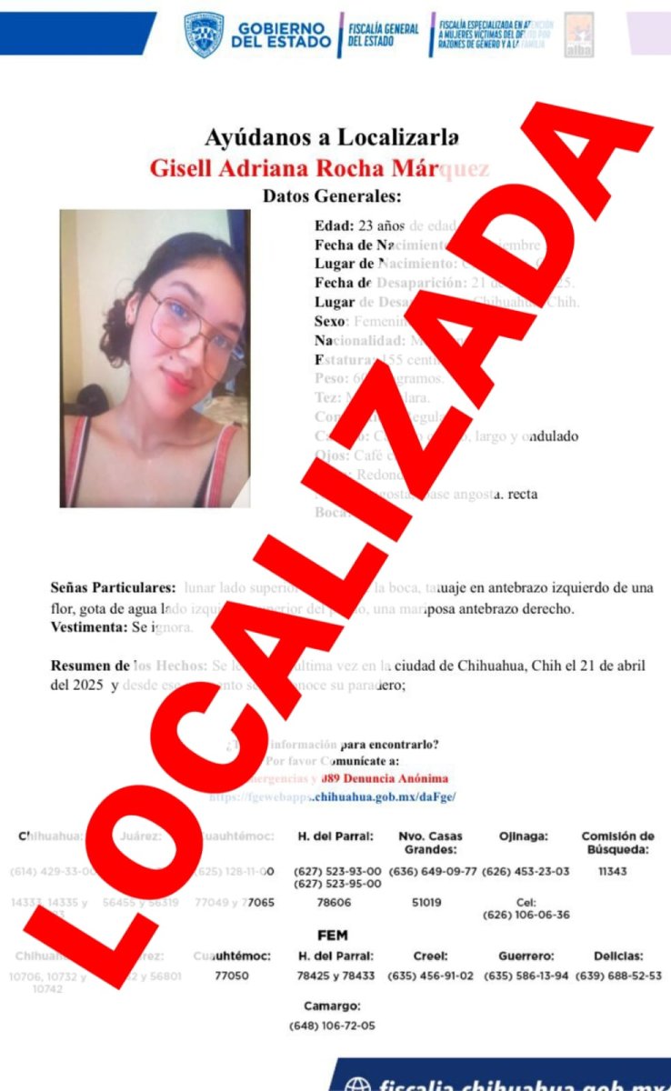 En seguimiento a indagatorias a cargo de la Fiscalía Especializada en Atención a Mujeres Víctimas del Delito por Razones de Género y a la Familia, fue localizada Gisel Adriana R. M. de 23 años de edad, quien contaba con reporte de ausencia interpuesto el 23 de abril del 2025.