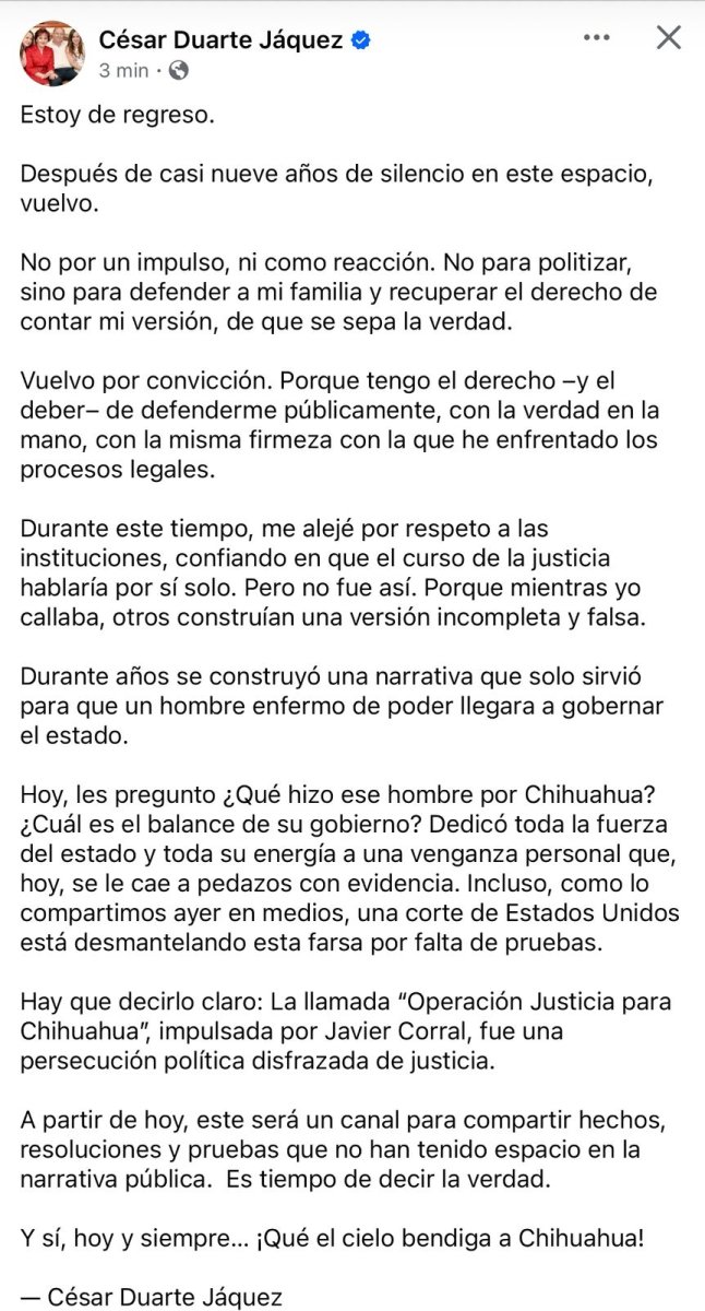 En su post de Facebook, Duarte, compartió que tras 9 años de silencio, utilizará sus redes sociales para evidenciar esta persecución, por parte del ahora morenista, Javier Corral.