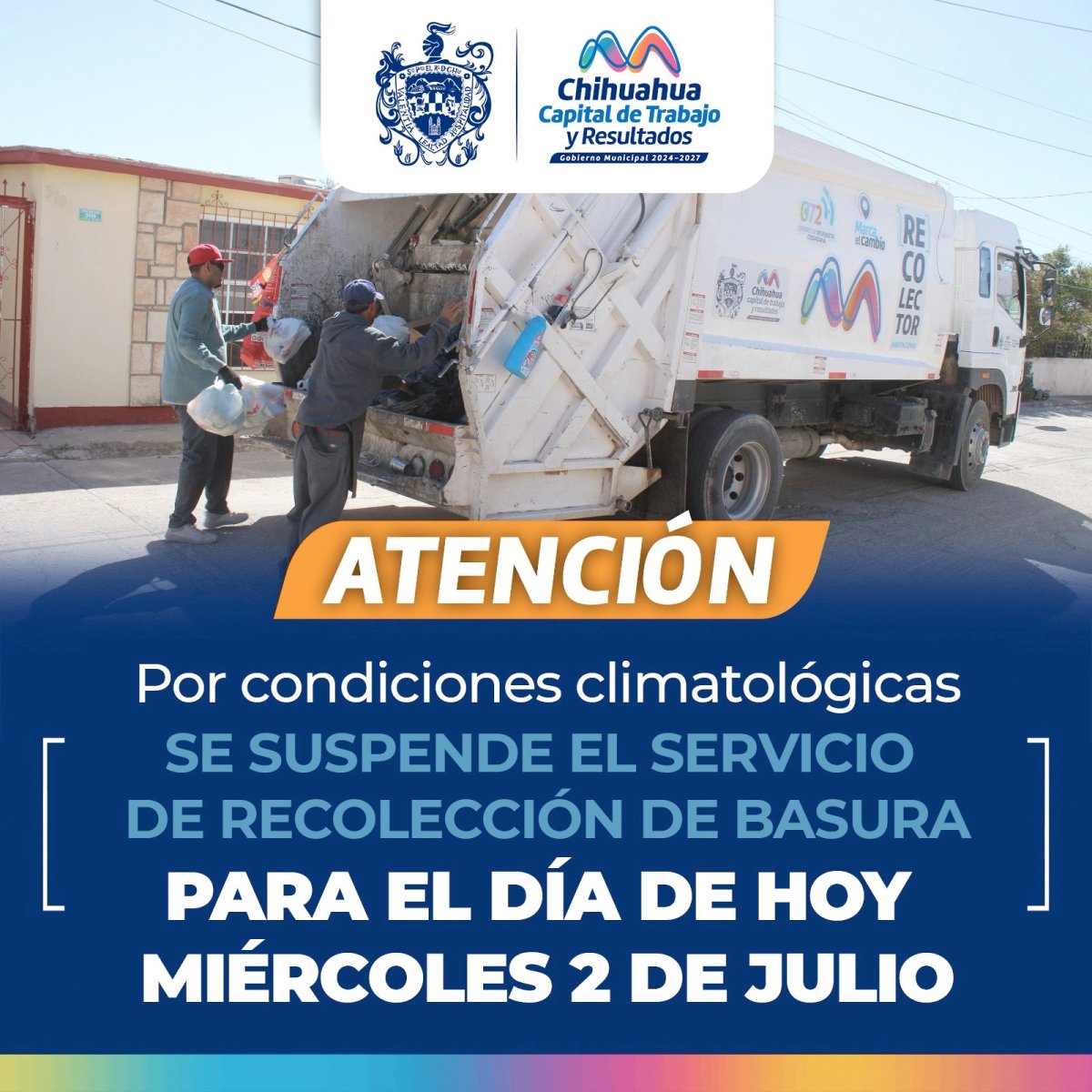 Derivado de las adversas condiciones climatológicas que se registran en la Capital del estado, el servicio de recolección de basura habitacional se verá suspendido este miércoles 2 de julio, hasta que las condiciones mejoren.