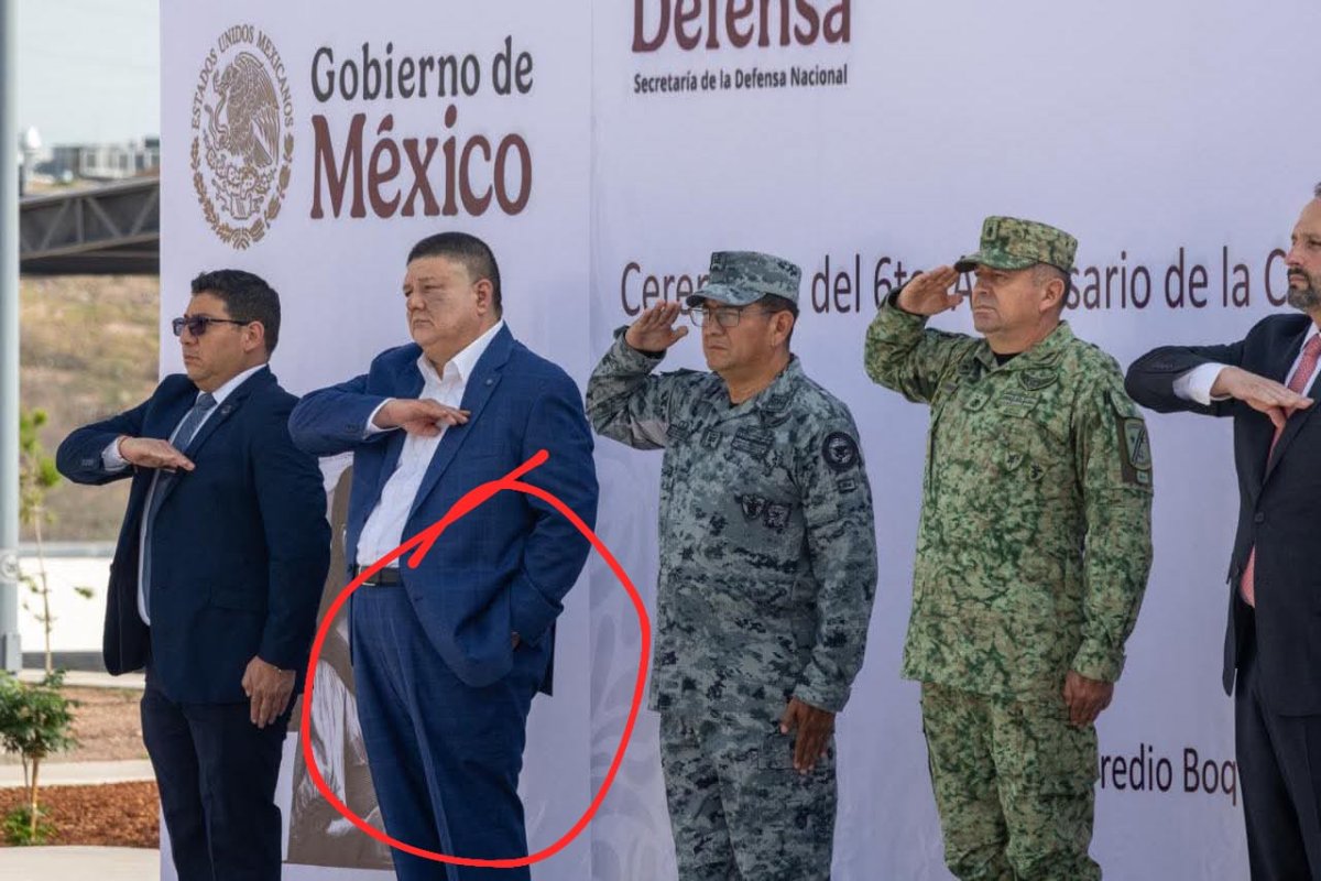 Circula en redes una fotografía del Fiscal General del Estado, César Jáuregui, en la que se le observa realizando los honores a la Bandera con la mano en el bolsillo