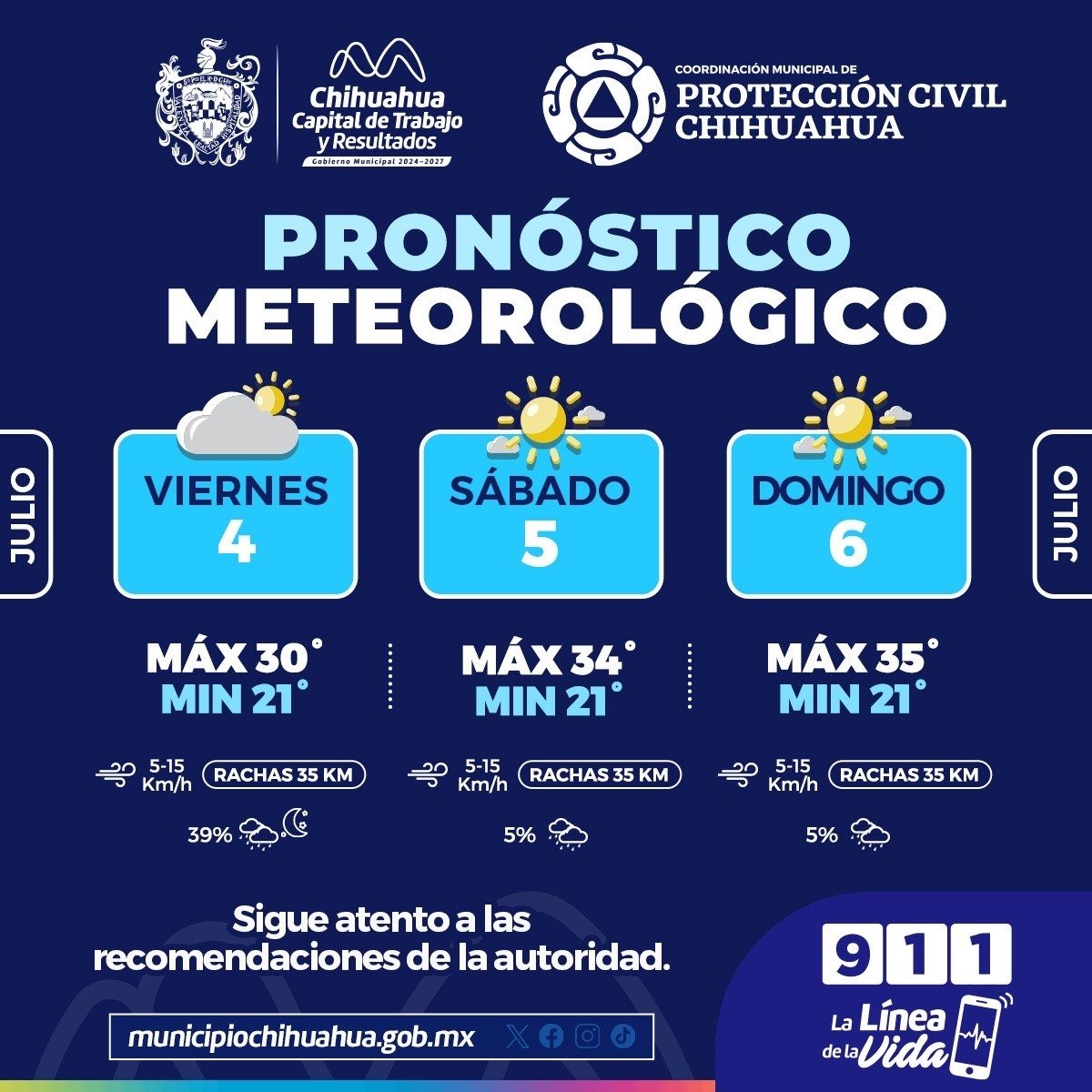 La Coordinación Municipal de Protección Civil, informa que, para este fin de semana del 4 al 6 de julio, se esperan tardes calurosas con probabilidad de lluvias por las tardes, para que las familias continúen cuidándose de las inclemencias del clima.