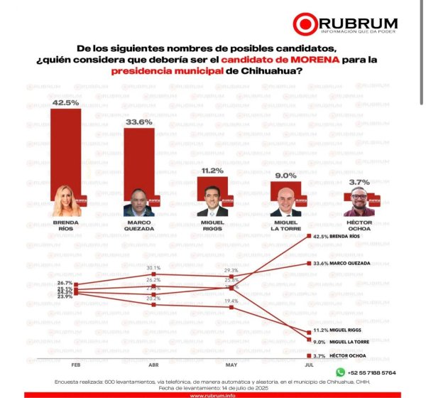 En una reciente encuesta, realizada por Rubrum el 14 de julio de 2025, sobre 600 levantamientos, la diputada Brenda Ríos aventaja entre los perfiles a la candidatura de Morena a la alcaldía de Chihuahua.