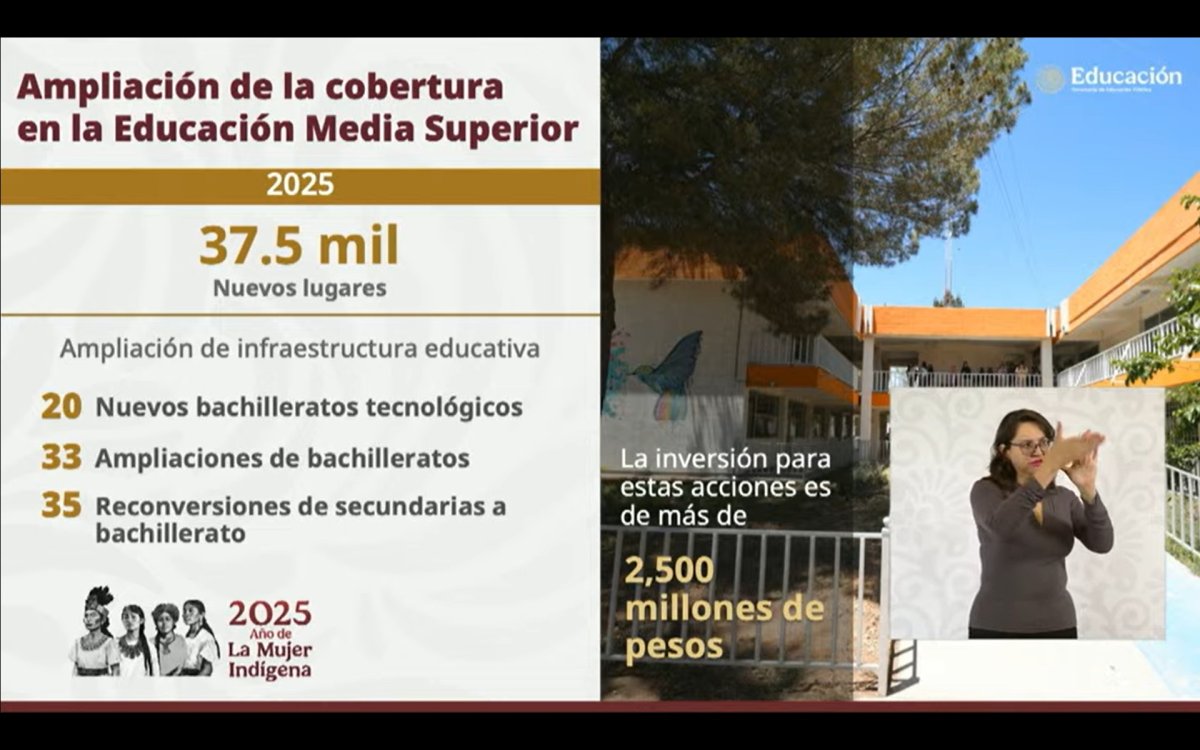 Dijo que, para el programa de ampliación de cobertura en ese nivel, se tendrán 20 nuevos bachilleratos, 33 ampliaciones y 35 reconversiones de secundarias a bachilleratos.