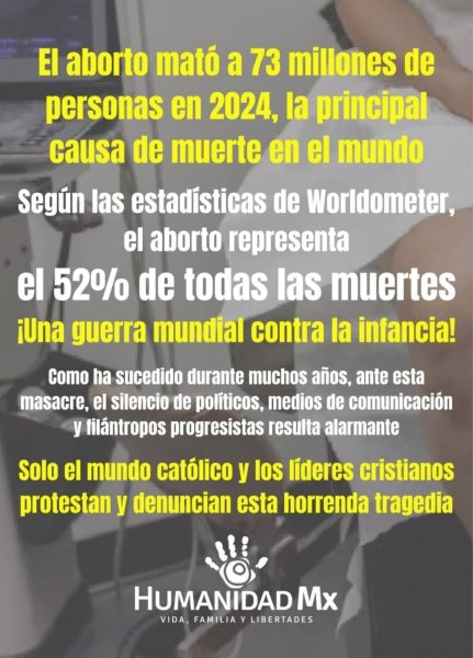 La información que circuló Enrique Serrano, es promovida por la agrupación Humanidad MX, detalla que el aborto mató a 73 millones de personas en 2024, siendo la principal causa de muerte en el mundo