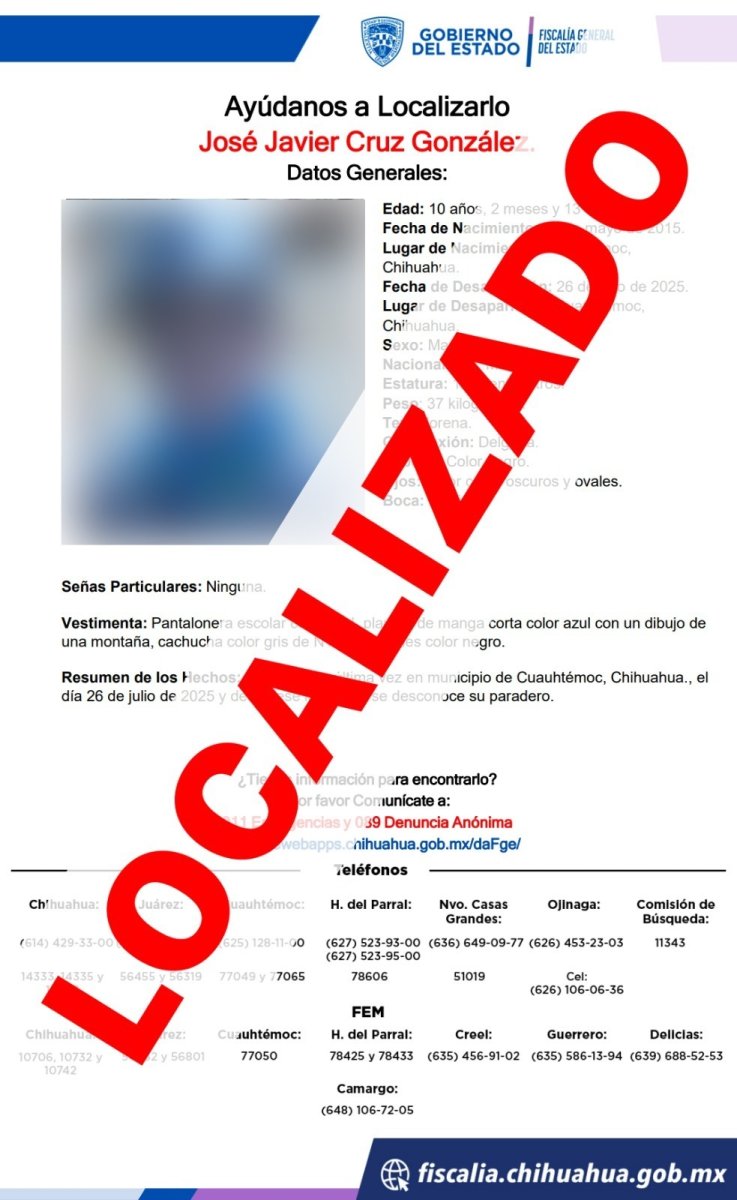 La Fiscalía de Distrito Zona Occidente, concluyó la carpeta de investigación iniciada por el reporte de ausencia y/o desaparición que interpuso la familia del niño de iniciales J. J. C. G., de 10 años de edad, tras localizarlo sano y salvo.