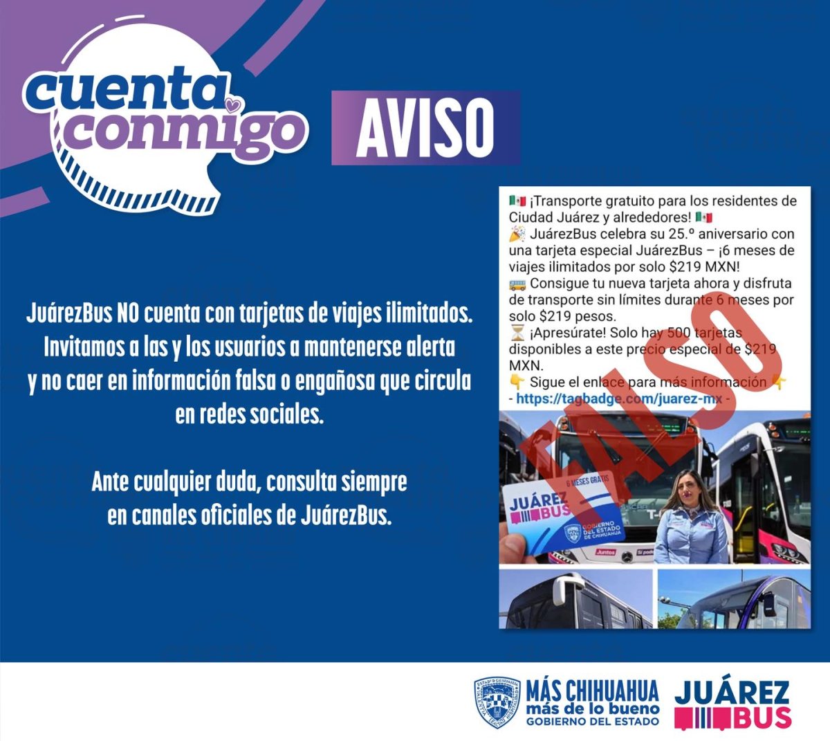 Tras darse a conocer en redes sociales la oferta de tarjetas del JuárezBus que tienen viajes ilimitados, el secretario general de gobierno, Santiago De la Peña Grajeda, declaró que, no hay este tipo de tarjetas, pidió a los juarenses no dejarse engañar por dichas ofertas, “es falso, no hay tarjetas semestrales, no hay tarjeas mágicas”