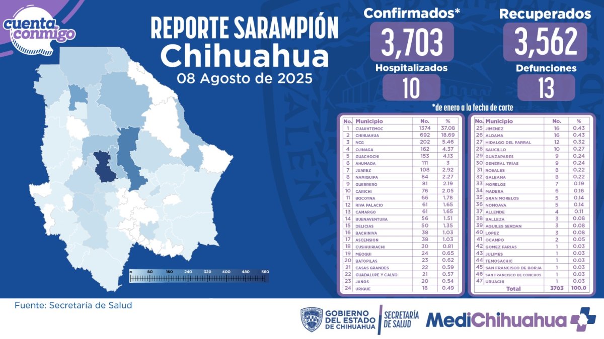 Cabe señalar que, el último deceso fueron dos personas de la etnia Rarámuri a causa de sarampión, el primer caso se trata de una menor de 6 años del municipio de Carichí, el segundo caso se trata de un hombre de 54 años del municipio de Bocoyna.