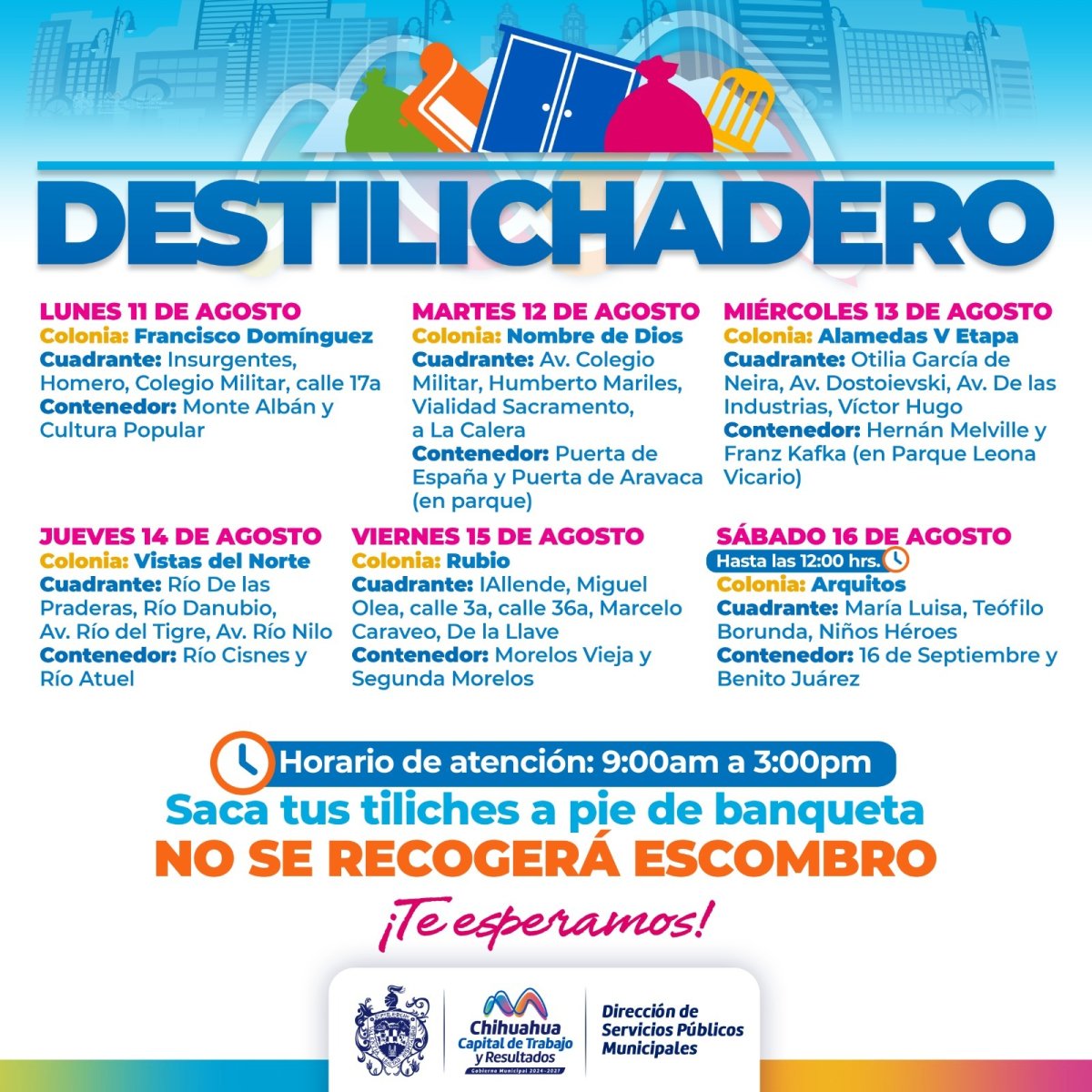 Para evitar acumulaciones de basura de grandes dimensiones en las viviendas, que podría generar plagas o problemas de salud, el Gobierno Municipal, a través de la Dirección de Servicios Públicos Municipales, informa el calendario del programa Destilichadero, que se realizará del 11 al 16 de agosto en seis colonias de la Capital.