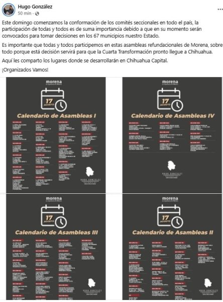 El presidente del Consejo Estatal de Morena, publicó las fechas por secciones electorales que corresponderán a los municipios de Chihuahua, y varios morenistas ya están a la espera de las que corresponderán ese mismo domingo en los demás municipios.