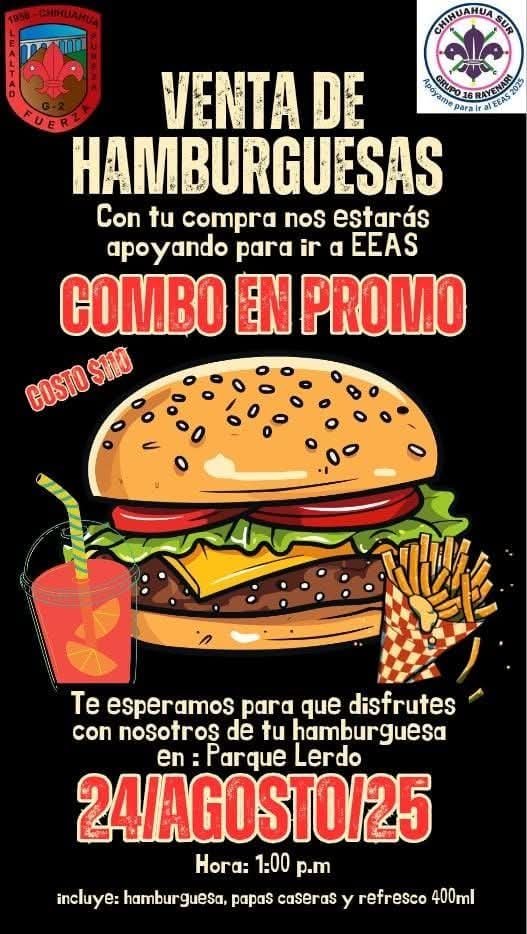 El combo de hamburguesa consta de papas y refresco, la venta dará inicio a la 01:00 de la tarde en el parque en mención, actividad a cargo del Grupo 16 Scout de la Provincia Chihuahua Sur.