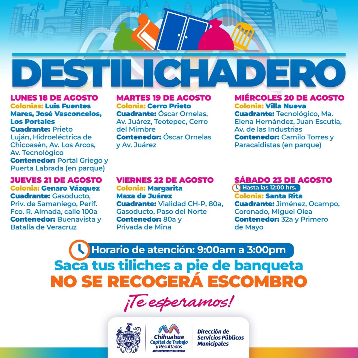 Para evitar acumulaciones de basura de grandes dimensiones en las viviendas, que podría generar plagas o problemas de salud, el Gobierno Municipal, a través de la Dirección de Servicios Públicos Municipales, informa el calendario del programa Destilichadero, que se realizará del 18 al 23 de agosto en seis colonias de la Capital.