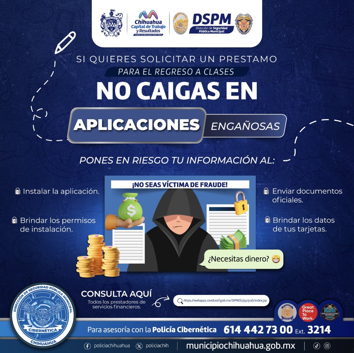 Ante el regreso a clases y los gastos que conlleva para las familias, la Policía Cibernética Municipal exhorta a las y los chihuahuenses a tomar en cuenta algunas recomendaciones relacionadas con aplicaciones de préstamos fraudulentas que ofrecen servicios a través de redes sociales principalmente.