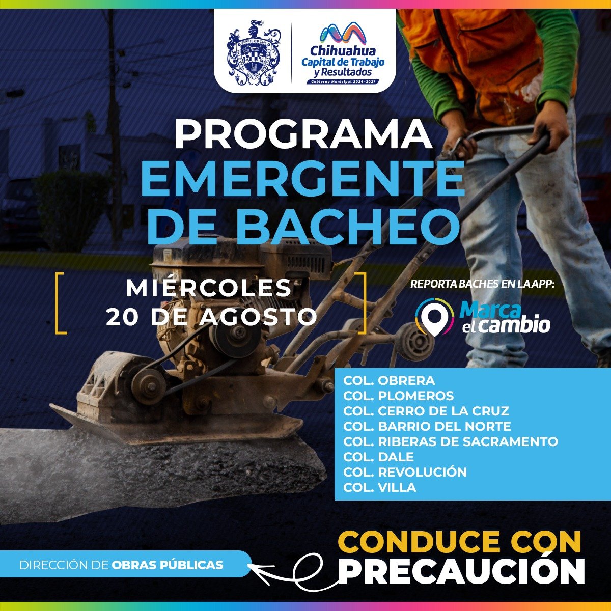 El Gobierno Municipal, a través de la Dirección de Obras Públicas, reparará baches hoy 20 de agosto, mediante el programa emergente, en calles de las colonias: Obrera, Plomeros, Cerro de la Cruz, Barrio del Norte, Riberas de Sacramento, Dale, Revolución y Villa