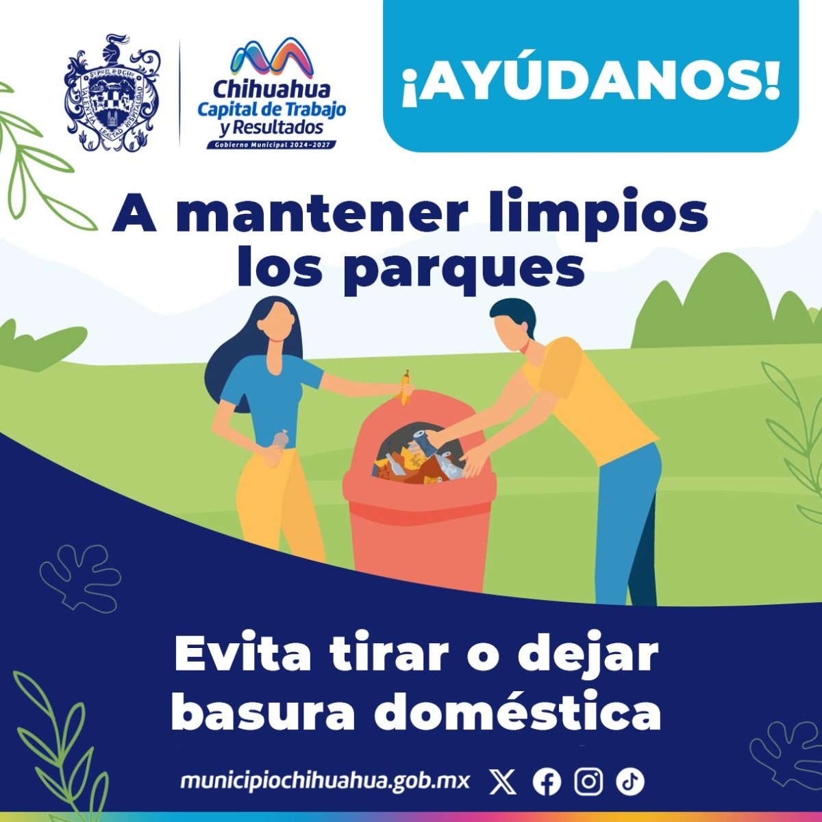 Con el objetivo de mantener espacios públicos limpios y en buenas condiciones para el disfrute de las familias, el Gobierno Municipal, a través de la Dirección de Mantenimiento Urbano, exhorta a la ciudadanía en general a no depositar basura doméstica o comercial en parques de la ciudad de Chihuahua.