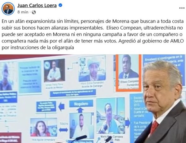 "En un afán expansionista sin límites, personajes de Morena que buscan a toda costa subir sus bonos hacen alianzas impresentables. Eliseo Compean, ultraderechista no puede ser aceptado en Morena ni en ninguna campaña a favor de un compañero o compañera nada más por el afán de tener más votos. Agredió al gobierno de AMLO por instrucciones de la oligarquía", expresó en redes sociales.