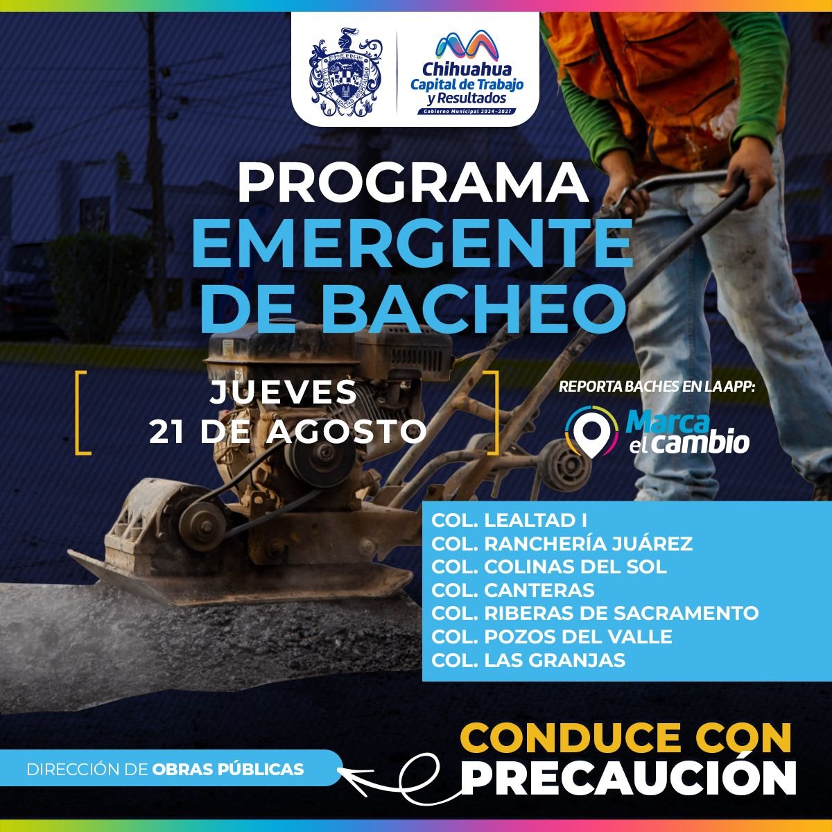 El Gobierno Municipal, a través de la Dirección de Obras Públicas, trabajará con bacheo este 21 de agosto mediante el programa emergente en calles de las colonias: Lealtad I, Ranchería Juárez, Colinas del Sol, Canteras, Riberas de Sacramento, Pozos del Valle y Las Granjas.