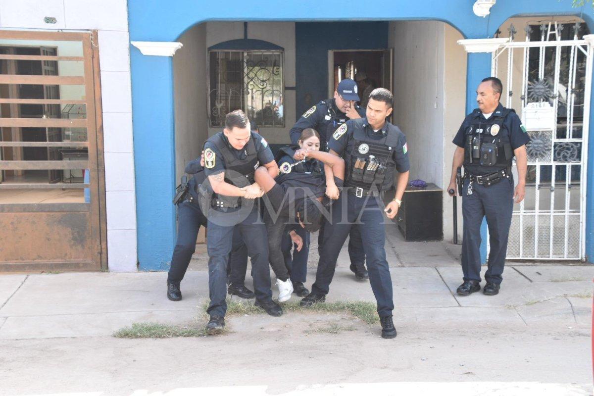 Elementos de la Policía Municipal acudieron al domicilio y al tratar de detener al agresor, éste también intentó agredir a los oficiales, por lo que fue necesaria la intervención de más unidades de apoyo.