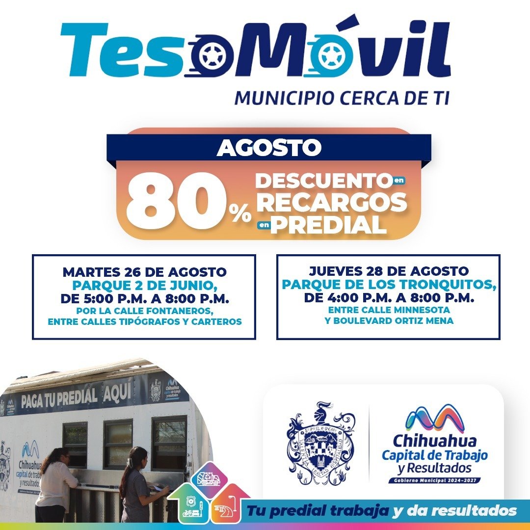 Asimismo, se informa que el Teso Móvil acudirá a dos parques de Chihuahua Capital en esta semana, para que las y los ciudadanos puedan aprovechar este estímulo y estar al corriente con su Predial, donde también podrán realizar convenios de pago o resolver dudas de su predio.