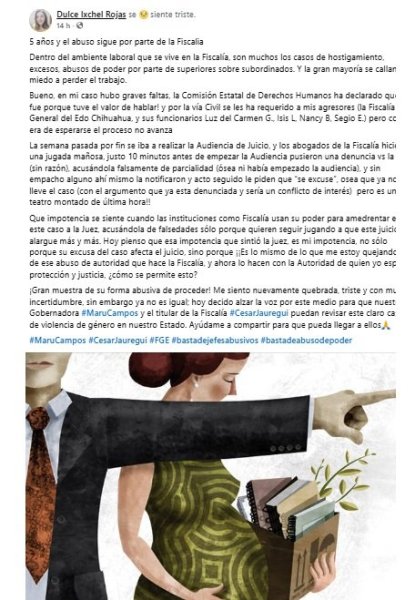 A través de las redes sociales, una persona identificada como Dulce Ixchel Rojas señaló que fue víctima dentro de la Fiscalía General del Estado, presentó demandas y la juez que llevaba el caso fue amedrentada para que difiriera la audiencia y se excuse del caso.