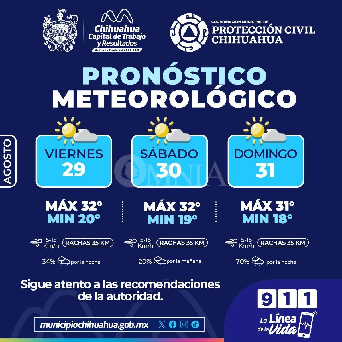 El sábado 30 continuará parcialmente nublado, con 32°C como máxima y 19 °C como mínima, y viento similar, así como la probabilidad de lluvia será 20 por ciento por la mañana.