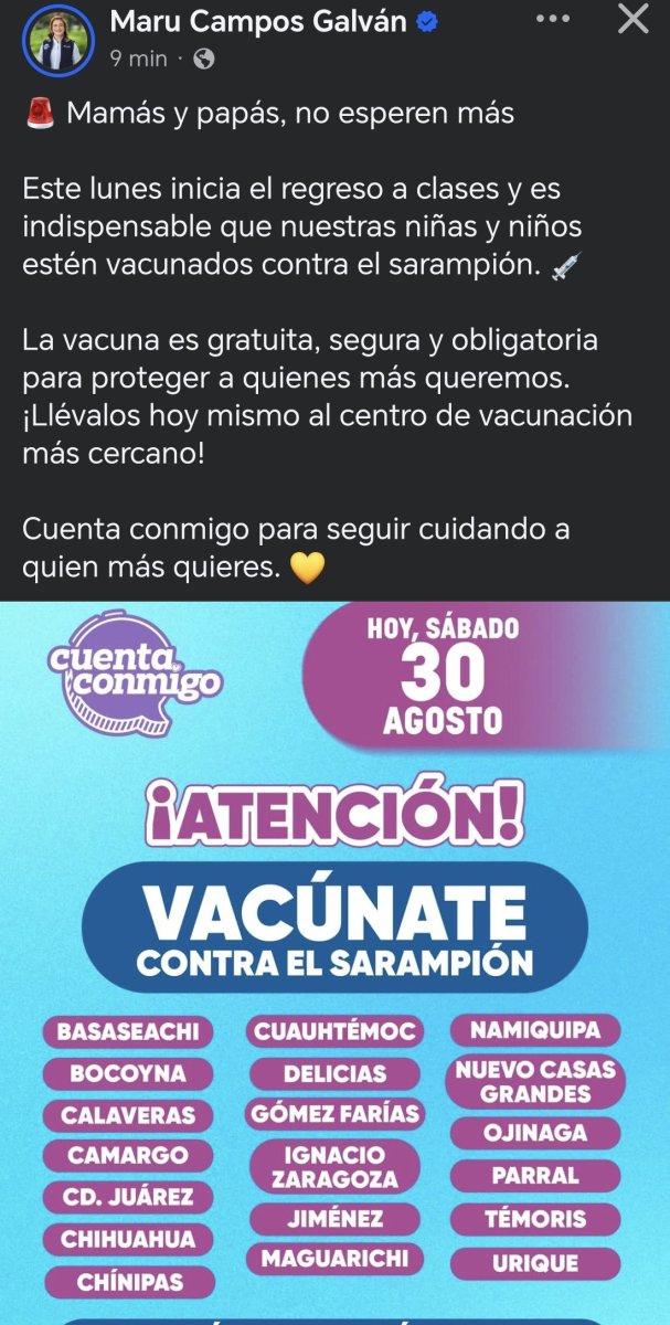 La gobernadora María Eugenia Campos Galván continúa con el llamado a padres de familia para llevar este fin de semana a aplicarse la vacuna contra el sarampión.