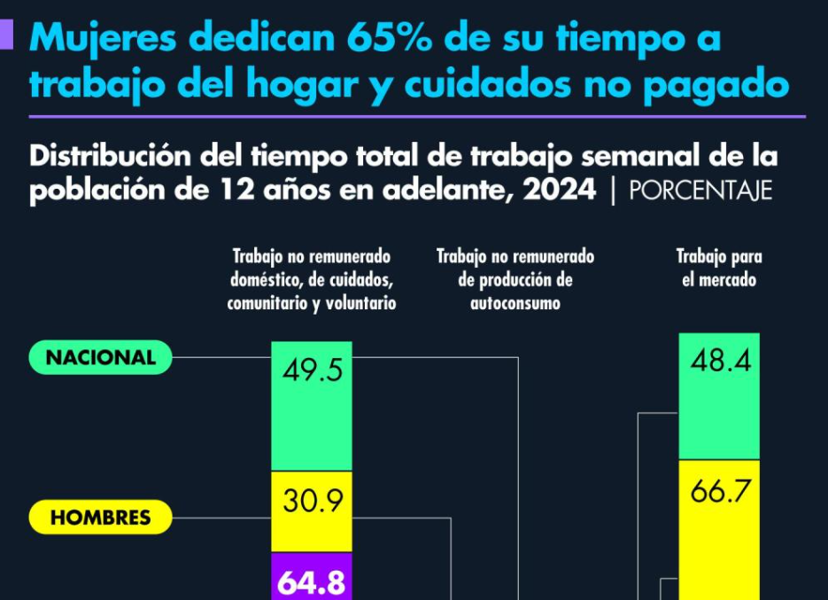 Al corte del 2024 se observó que el 64.8% del tiempo de las mujeres lo dedican al trabajo doméstico y de cuidados no pagado, de acuerdo con cifras de la Encuesta Nacional de Uso del Tiempo (ENUT) del Inegi.