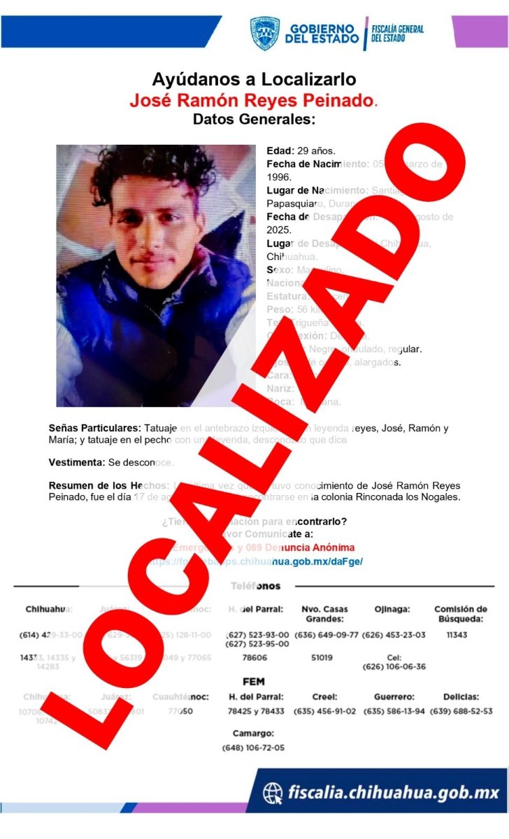 La Unidad de Investigación de Personas Ausentes y/o No Localizadas de la Fiscalía de Distrito Zona Centro (FDZC) localizó sano y salvo a José Ramón R. P., de 29 años de edad, quien contaba con reporte de ausencia interpuesto en la ciudad de Chihuahua.